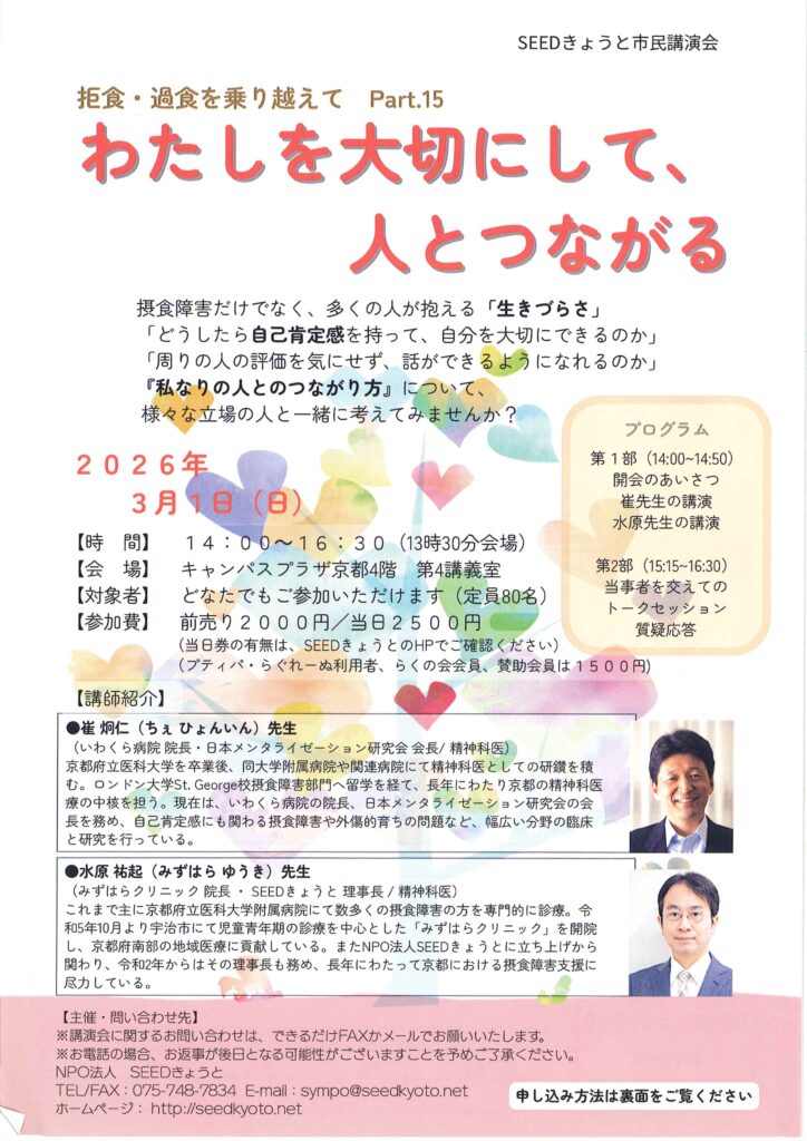 またNPO法人SEEDきょうとに立ち上げから関わり、令和2年からはその理事長も務め、長年にわたって京都における摂食障害支援に尽力している。