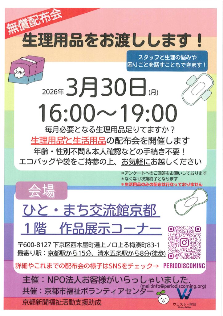 【下京区】生理用品をお渡しします【3月30日(月)】