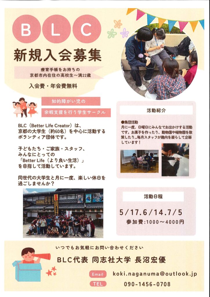 BLC (Better Life Creator)は、 京都の大学生(約60名)を中心に活動するボランティア団体です。