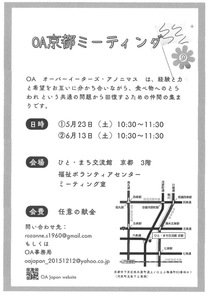 OA(オーバーイーターズ・アノニマス)は、経験と力と希望をお互いに分かち合いながら、食べ物へのとらわれ (過食・過食嘔吐・拒食・下剤乱用など)という共通の問題から回復するための仲間の集まりです。「自分の食べ方には何らかの問題がある」「食べ物を使って自分を傷つけるのをやめたい」と思う気持ちがあれば、誰でもメンバーになることが出来ます。