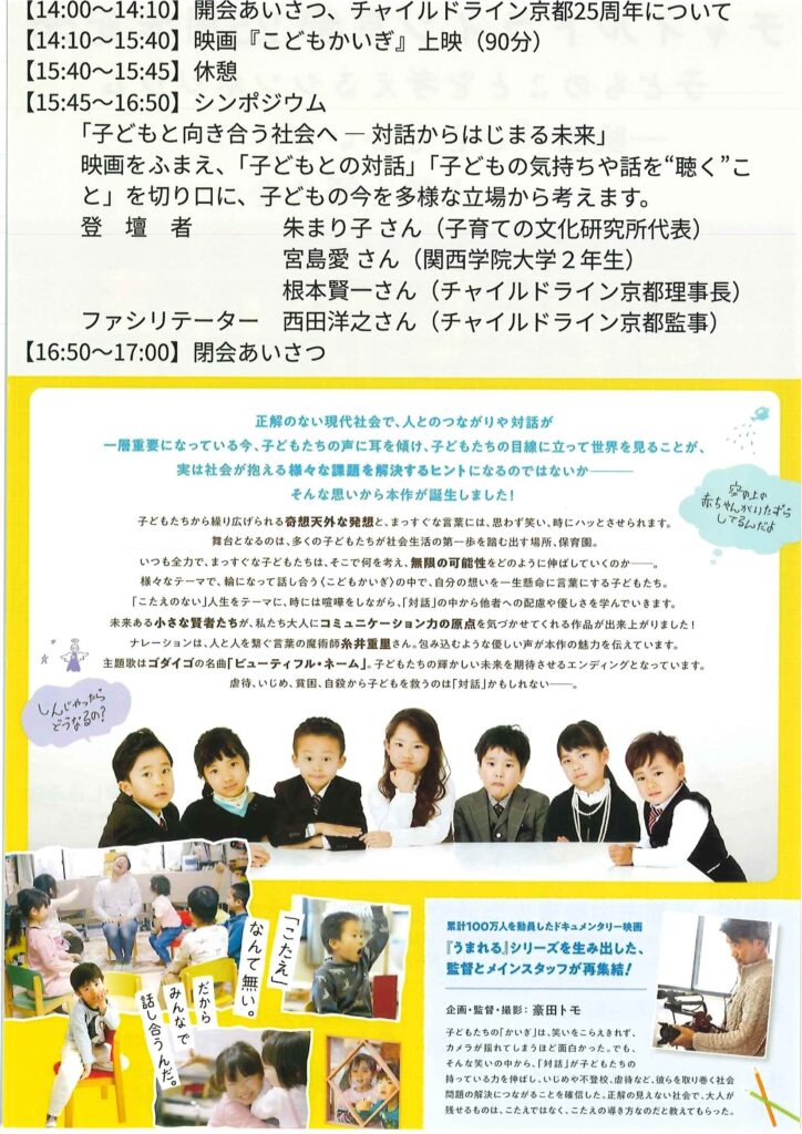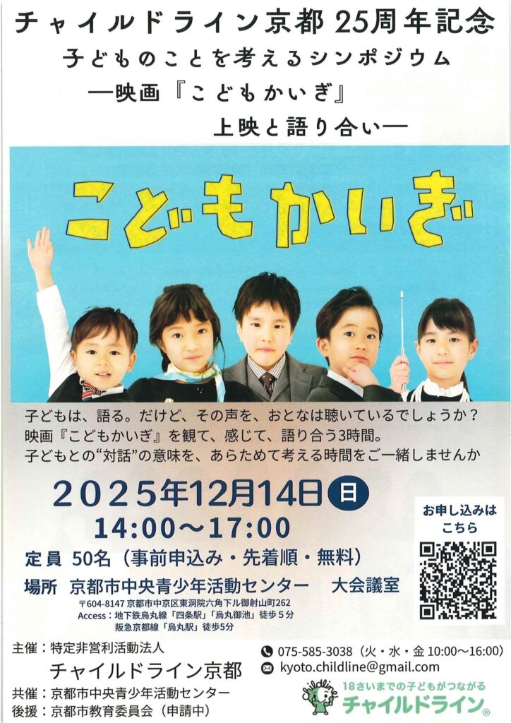 チャイルドライン京都は2025年、活動開始から25年の節目を迎えることを機に25周年記念事業として、子どもが安心して自分の気持ちを話せる社会をめざし、映画「こどもかいぎ」の上映をシンポジウムを通して「子どもの声を聴く」「子どもと対話する」など子どものことを考える場を設けます。