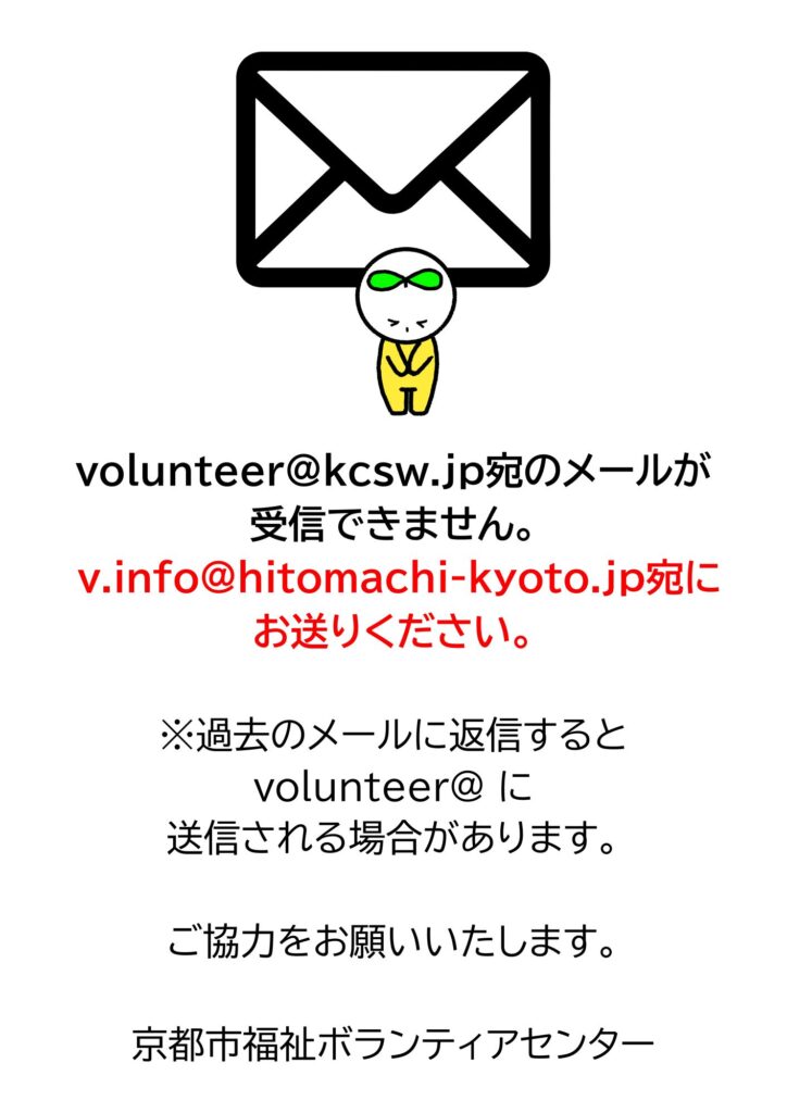 メールサーバーの都合により、volunteer@kcsw.jp宛のメールは受信できない状況となっております。