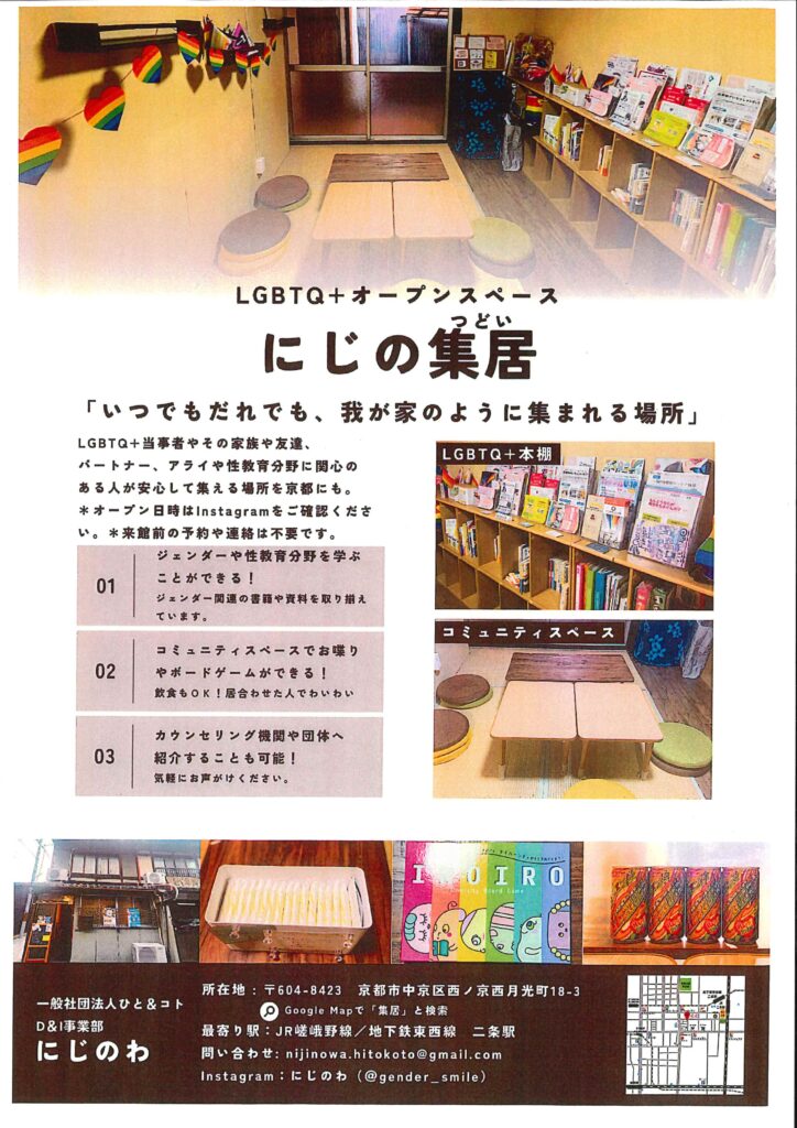LGBTQ+当事者やその家族や友達、 パートナー、アライや性教育分野に関心のある人が安心して集える場所を京都にも。